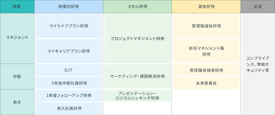 年齢・等級に応じた階層別研修を軸として、役割・職種などに応じたスキル研修、選抜研修や異業種交流的な社外セミナーへの派遣など、多様な研修を企画・運営しています。